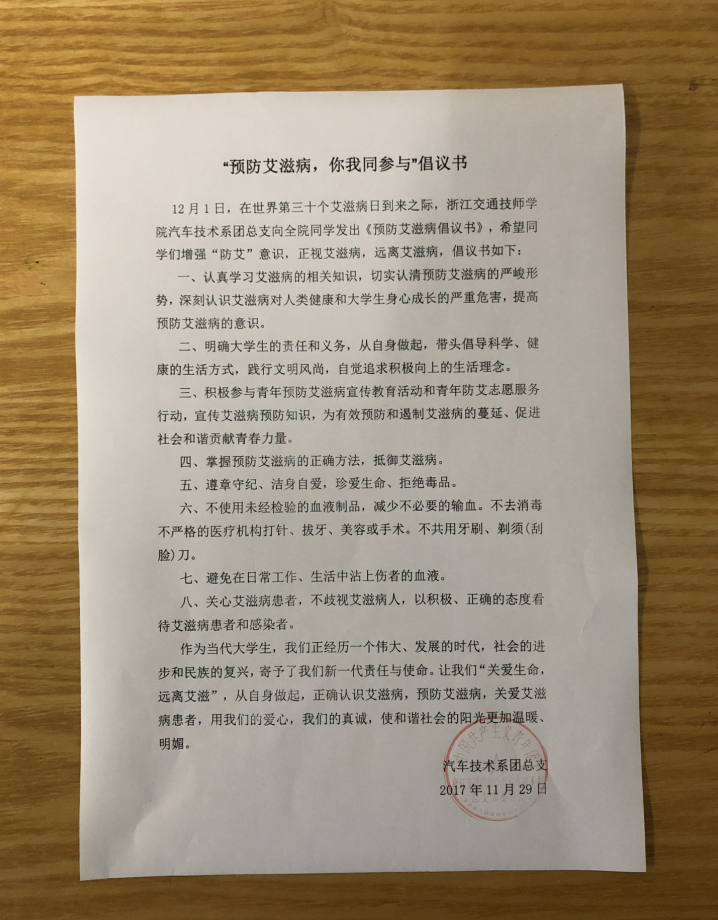 12月1日,在世界第三十个艾滋病日到来之际,浙江交通技师学院汽车技术系团总支向全院同学发出《预防艾滋病倡议书》,希望同学们增强“防艾”意识,正视艾滋病,远离艾滋病,倡议书如下:
