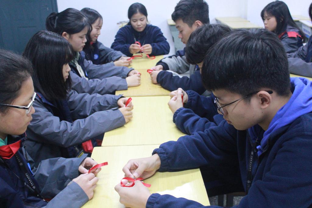 伴随着世界艾滋病日主题曲《飘动的红丝带》响起,团支书们开始学做红丝带,大家认真的神情传递着对艾滋病人的尊重和关心,一条条红丝带逐渐成型,如同一条条纽带将大家的心紧紧联系在一起。让我们用心参与艾滋病的预防工作,关注艾滋病人群体,为他们带去温暖与关怀。