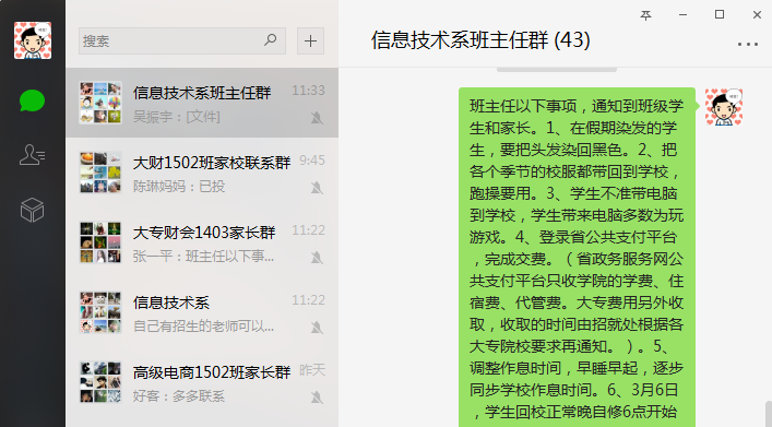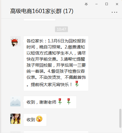 为了迎接新学期的到来,让学生回校后能尽快回归适应校园生活,方便家长了解学院的学生管理要求和作息时间,完成学生学费收缴等工作任务,近日信息技术系学生管理人员、班主任,通过微信、电话等通信方式和家长、学生进行沟通联系。