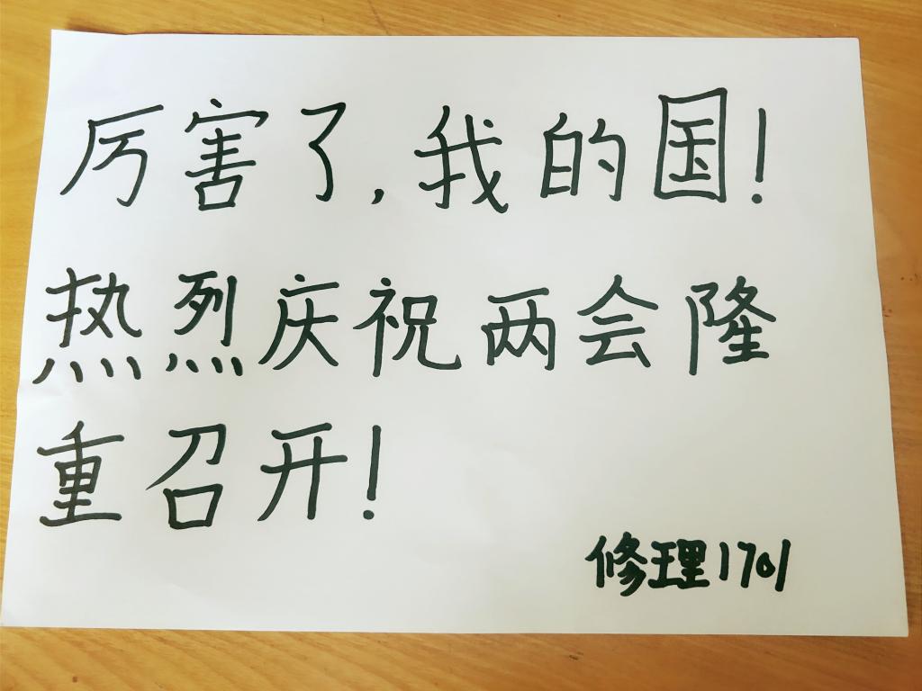 汽车技术系班级学生的“厉害了,我的国!热烈庆祝两会隆重召开!”、“创新先行,我们要做新时代的先进青年。”等寄语写出了青年学子的心声。