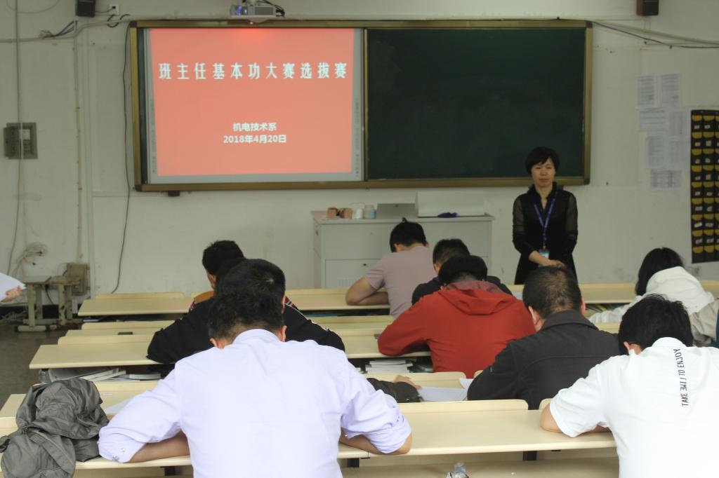4月20日,机电技术系在行一阶举行系部首次班主任基本功技能选拔比赛,比赛由机电系主任宗冬芳主持,学管干事盛景东、团总支老师王燕红及系部全体班主任参与本次比赛。
