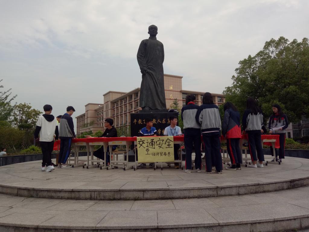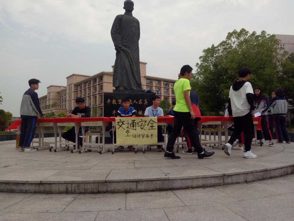 为了提高同学们的交通安全意识,经济贸易系学院部于今天下午3点10分在陶行知雕像举行了交通安全知识签名活动。