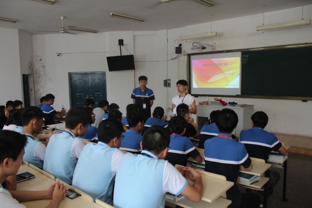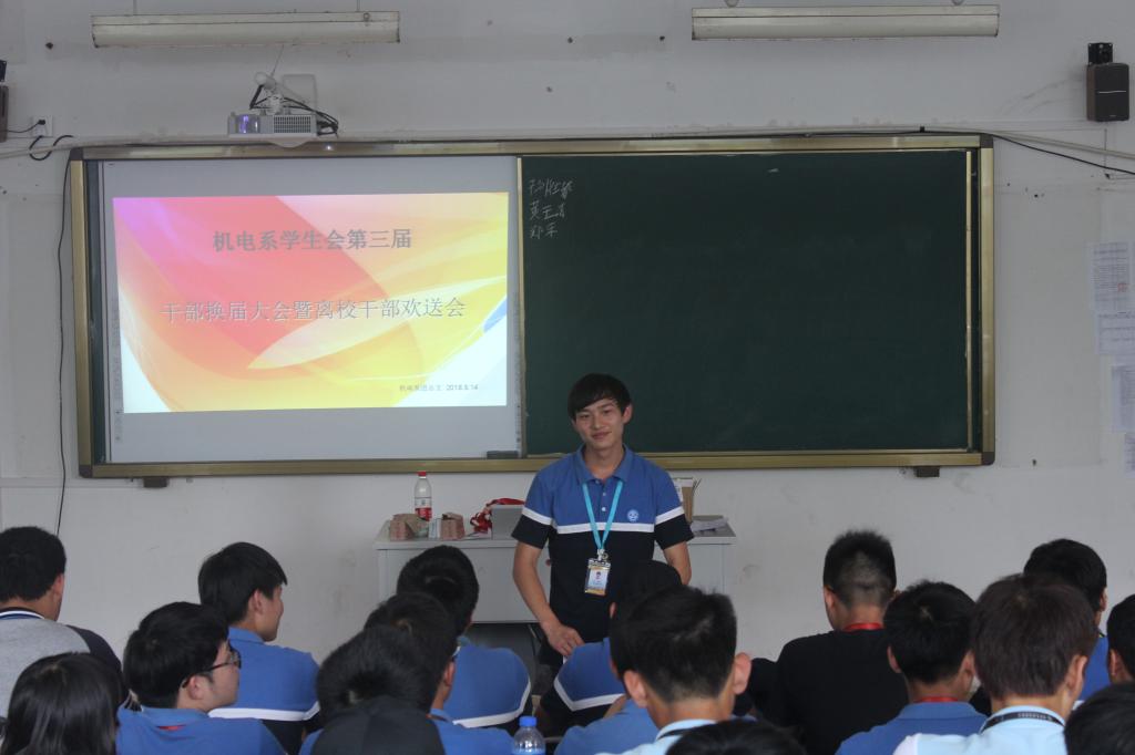5月14日,机电技术系学生会在行一阶举行第三届学生会干部换届大会暨毕业成员欢送会。大会由第三届学生会储备干部陈超主持,系团总支书记吴亦滨及系学生会全体成员参加了此次会议。