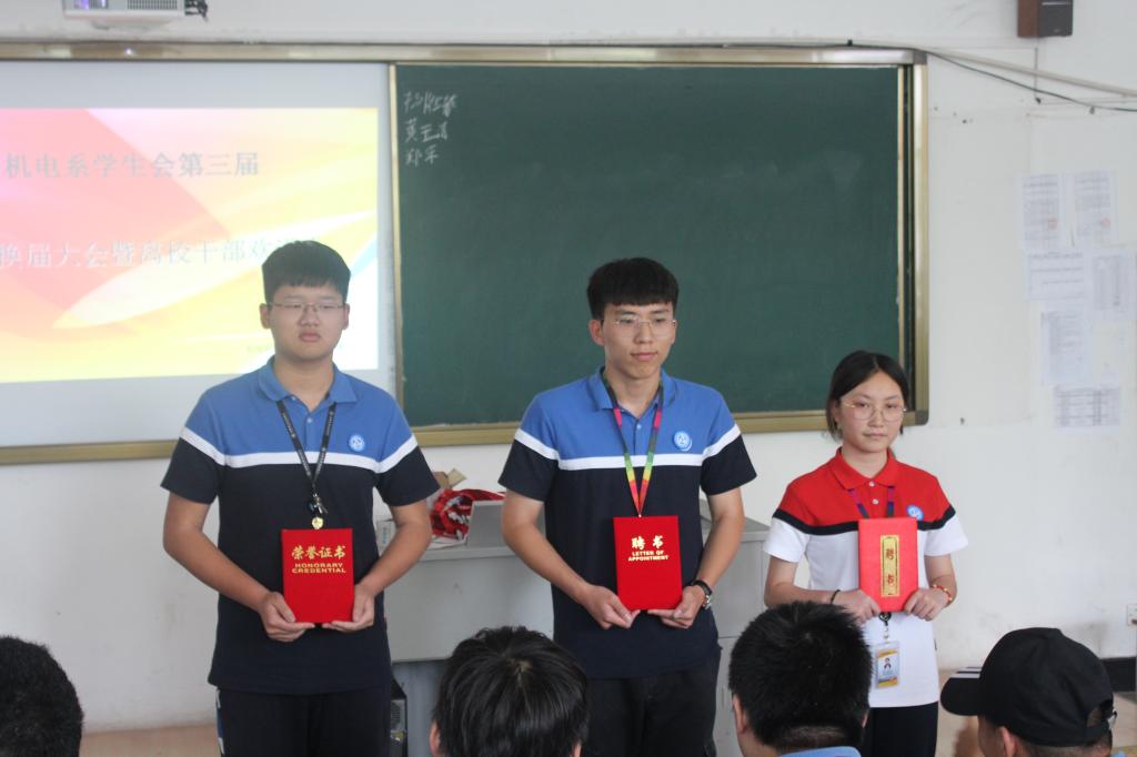 大会第一项,由系团总支书记吴亦滨宣布机电技术系第三届学生会干部名单,并为他们颁发聘书。由于系部专业增加了城轨方向专业,女生的比例将会越来越大,为了在未来工作中能更好的开展学生管理工作,经系领导和团总支共同商讨决定,成立全新部门——女生部。至此,机电技术系第三届学生会正式成立。