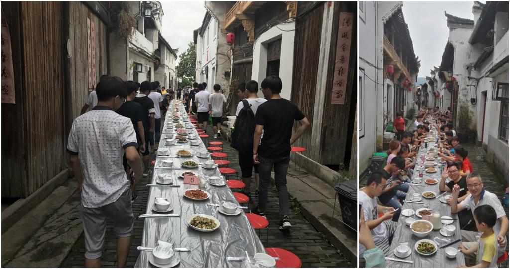 游历完老街,大家已经闻到了阵阵香气,那是大厨正在准备一会儿的“豆腐宴”,“豆腐宴”原料简单,就是家常的豆腐,可此时在大厨的手下生了花。基础部师生们入席就座,约10人一桌,沿街开宴,一字排开,沿袭着自古以来的传统。开宴的场景煞是壮观,豆腐宴材料均取自村民手工豆腐干和当季新鲜食材,因此每一桌风味都有不同,大快朵颐的食客,忙忙碌碌的大厨,让这平静的老街些许恢复了当年的生机。