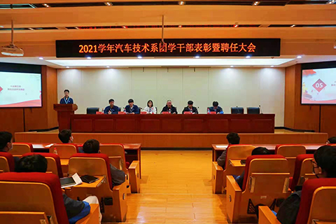 11月10日下午汽车技术系于精艺楼报告厅举办2021年团学工作总结表彰大会暨干部聘任大会。出席本次会议的有系学管副主任金学文老师、团总支书记童佳瑜老师、团总支副书记曲来宝老师、学生会执行主席徐昊男、毛杨琛、孙天翔,会议由王紫涛同学主持。