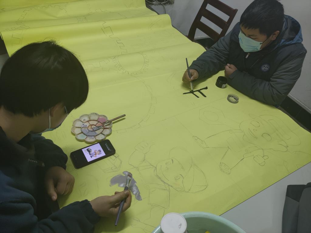 宣传部的成员们翻阅各种资料,最终确定整个海报的格局分布,先用铅笔描摹出人物、文字的大致形象,而后进一步用颜料上色,经过几个晚上的努力,他们用手中的笔描绘出精益求精,独具匠心的手艺人形象,一个个栩栩如生的工匠跃然纸上。海报内容简单易懂,精确表达了掌握好知识技能的重要性。