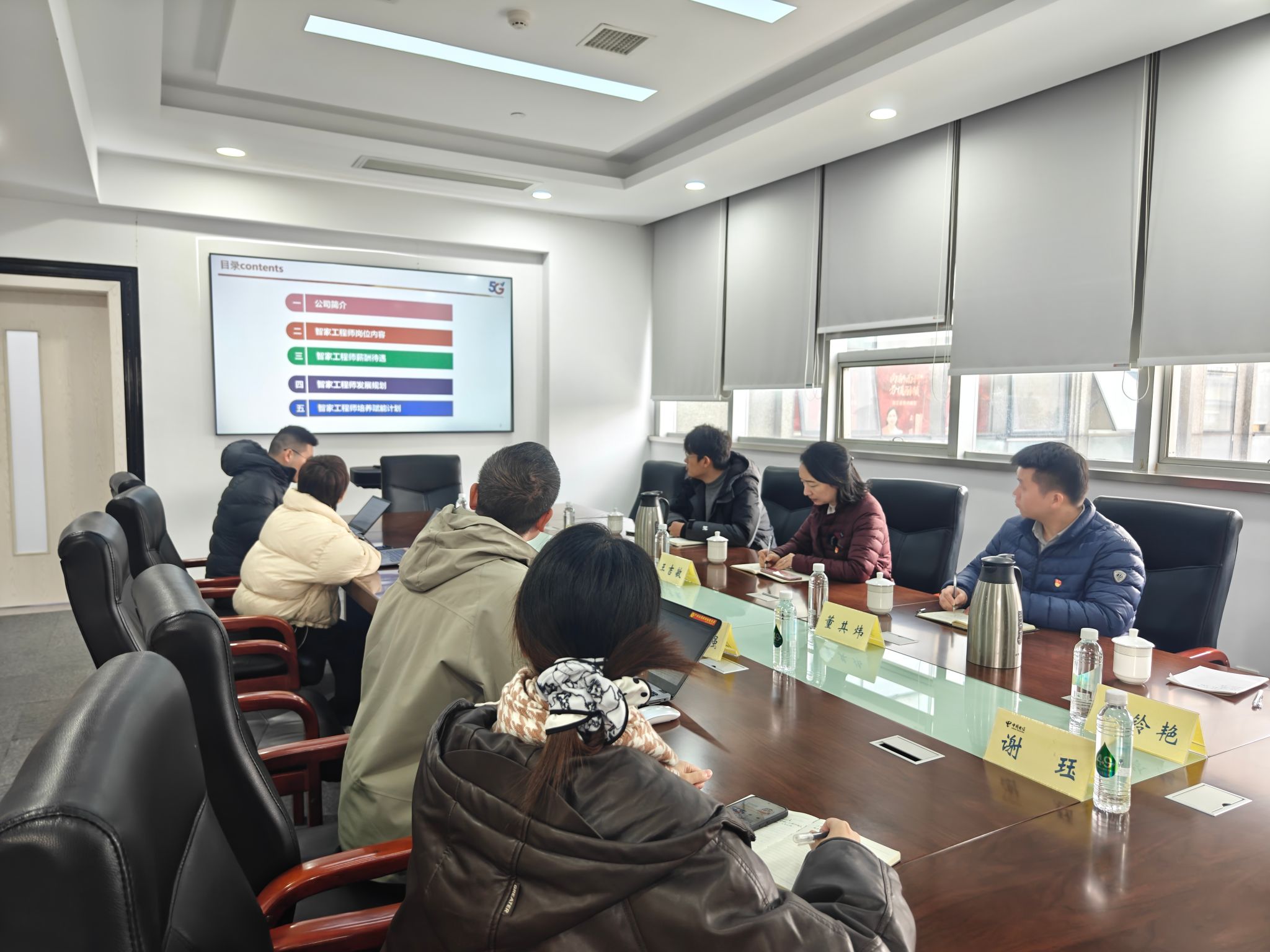 随后,双方召开“电信”订单班深度合作方案研讨会。会上,中国电信金华分公司政企部潘腾代表企业方率先发言,重点汇报了订单班定向培养的智家工程师岗位相关情况。从岗位需求人数、薪资待遇、福利保障体系,到畅通的职业晋升通道、分层分类的职业发展规划,再到针对订单班学员定制的专项赋能计划,均进行了全面细致的阐述,让校方对企业人才需求和培养期望有了更清晰的认知。