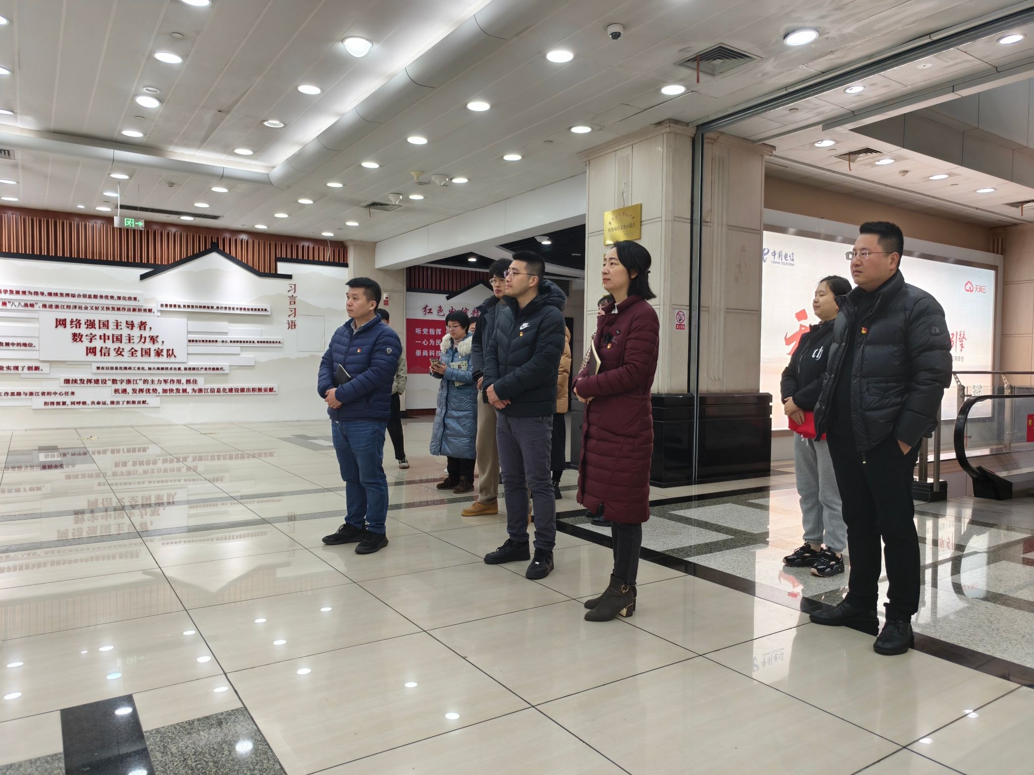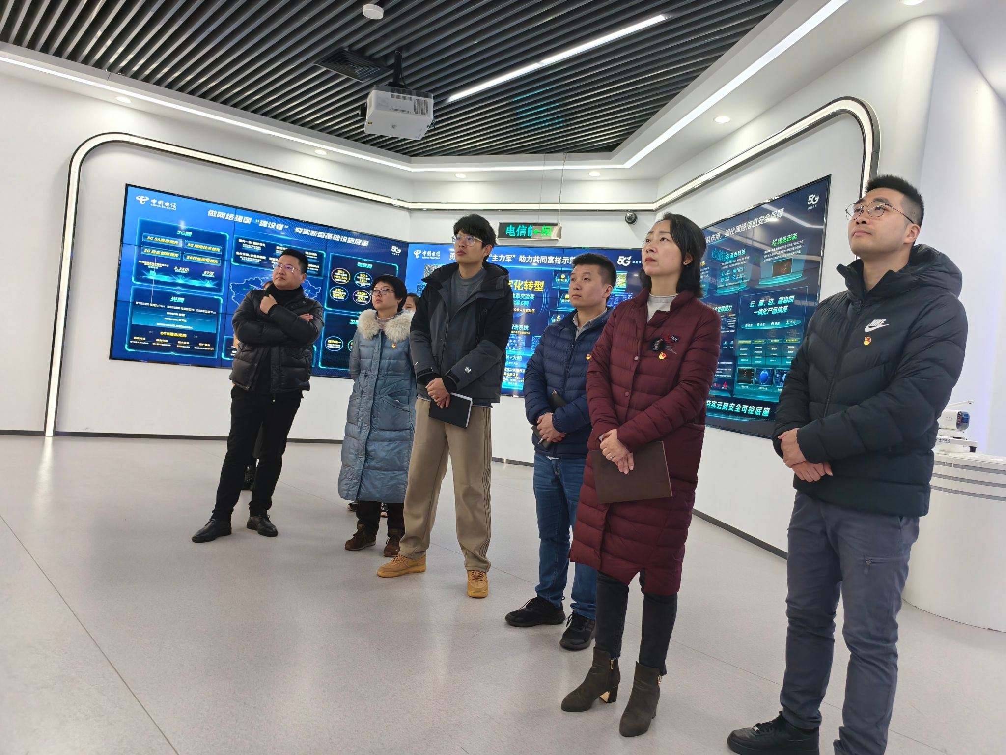 活动伊始,在电信相关负责人的引导下,运输管理学院一行人率先走进中国电信展厅。展厅内,“百年电信红色传承”主题展区格外醒目,习言习语展板、“听党指挥、服务人民”的红色基因展示,生动呈现了中国电信作为“网络强国主导者、数字中国主力军、网信安全国家队”的责任担当,让一行人深刻感受到党建引领下“红色电信”的精神内核与发展脉络。同时,通过实地观摩、现场讲解,大家也详细了解了企业在数字智能、物联网应用、智慧家庭等领域的前沿技术成果与业务发展布局,将红色传承与技术创新相结合,不仅直观感受了行业发展趋势对专业人才的新要求,更深化了党建引领校企合作育人的认知,为后续订单班课程体系优化、人才培养目标定位筑牢了思想与实践基础。