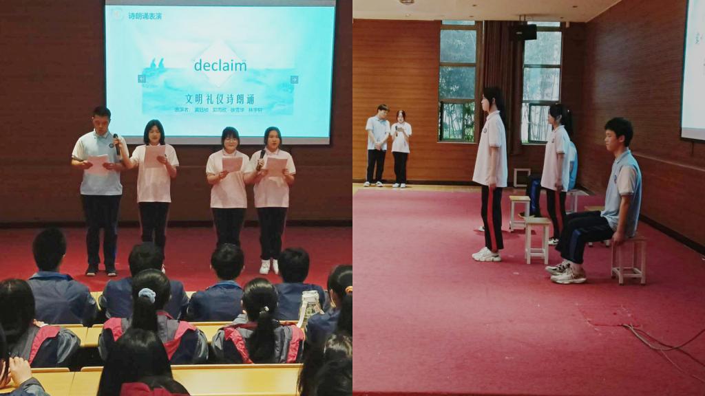 班会从知礼仪、懂礼仪、学礼仪、践礼仪四步入手,层层递进,引导同学们克服不良行为习惯,争做文明懂礼的时代好青年。在激烈的讨论后 ,各小组同学通过“学礼仪诗歌朗诵”和“文明礼仪操”展示了对践行礼仪的决心和信心。