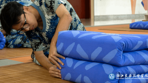 在内务整理上,"豆腐块"棱角分明,洗漱用品成线排列,原本从不叠被的学生3分钟就能完成标准内务,展现出惊人适应力。教官手把手教学叠被技巧,同学们互相切磋"收纳秘籍",在互助中提升内务标准。